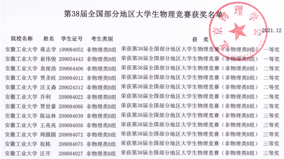 参赛的29名同学在非物理类B组比赛中获得佳绩:12位同学获奖,其中一等奖2人,二等奖4人,三等奖6人。