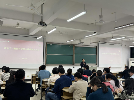 在数理楼403召开全院教职工大会暨第三届教授委员会委员换届选举大会。学院全体教职工参加了本次会议,会议由院长杨二光主持。