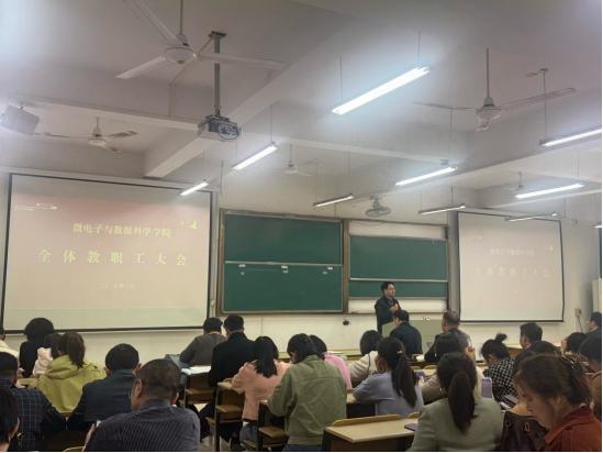在数理楼403召开全院大会,学院全体教职工参会,会议由学院党委书记汪春胜主持。