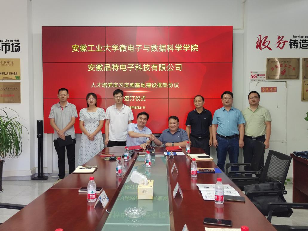 在安徽品特电子科技有限公司,企业负责人夏林胜总经理介绍了企业的业务范围、工艺流程和设备等。杨二光介绍了学院的人才培养和学科建设等情况,汪春胜期待双方能在人才培养、实习实训、就业和项目合作等方面密切合作,实现高质量的产教融合。双方签订了校企实习实训基地框架协议。