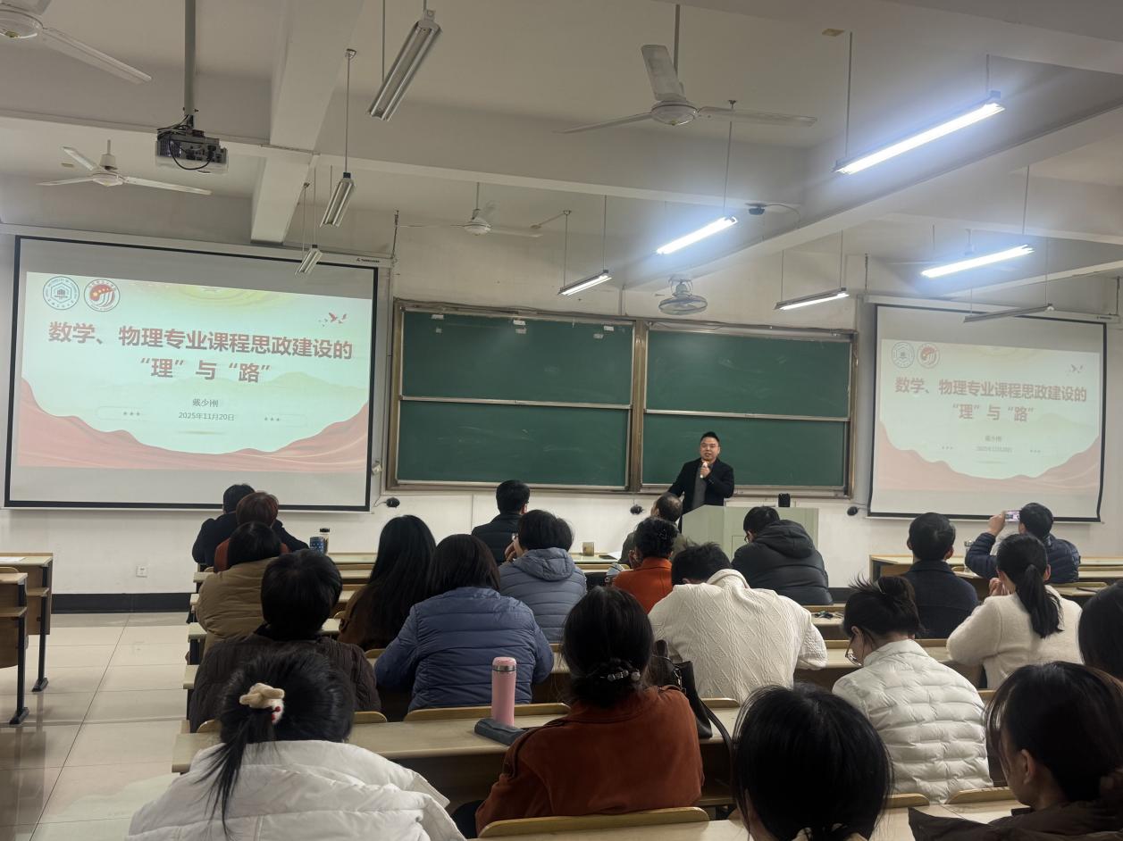 马克思主义学院戴少刚博士作题为《数学物理专业课程思政的“理”与“路”》的专题报告。会议由学院院长杨二光主持,全体教职工参与此次活动。