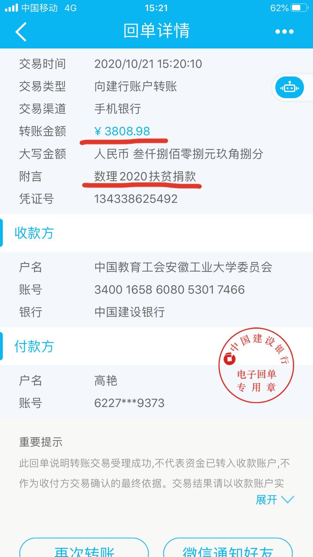 为响应校工会组织的2020年定向扶贫捐款活动,数理学院老师们积极参与为贫困乡镇捐款,全院110人,其中97人参与捐款,共计捐款3808.98元,此次捐款将用于六安市裕安区西河口乡红石岩村和独山镇沙岗店村扶贫项目。现将捐款明细及上交款项公示。