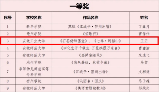 丹青吐彩迎国庆,翰墨飘香颂华夏。我院师生踊跃参与,以优秀文艺作品为载体,创作了一篇篇优秀的汉字书写作品,抒发了新时代青年饱满的爱国热情,充分展现了我院广大师生的文化自觉、文化自信和文化担当,传递出昂扬向上的社会正能量。本次“翰墨庆华诞”安徽省高校校园汉字书写大赛,共评出一等奖10件,二等奖20件,三等奖38件,优秀奖37件。51视频