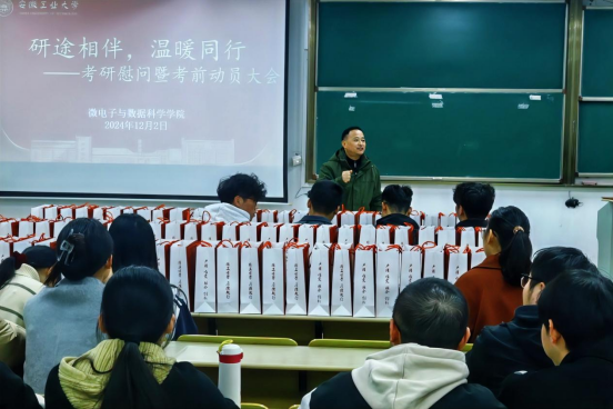 在数理楼403举办了考研慰问暨考前动员大会,向正在紧张复习备考的学子们送去温暖与祝福。院党委书记汪春胜,院党委副书记、纪委书记、副院长张敏,毕业生辅导员张佳良、周文潇参加了本次活动。活动由张敏主持。