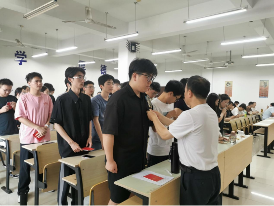 仪式在气势磅礴的《国际歌》中拉开帷幕。张敏宣读了学院党委关于党员发展和转正的批复。随后,汪春胜及各学生支部书记为新发展的预备党员佩戴党员徽章。全体新党员和老党员面向党旗庄严宣誓,誓言铿锵有力,表达了党员们对党的忠诚和为人民服务的决心。数据本科生党支部陈健平作为新党员代表发言,郑重承诺用实际行动践行初心使命。数学本科生党支部王紫焉作为老党员代表发言,对新党员予以祝贺,结合自身经历分享了入党后的成长感悟。