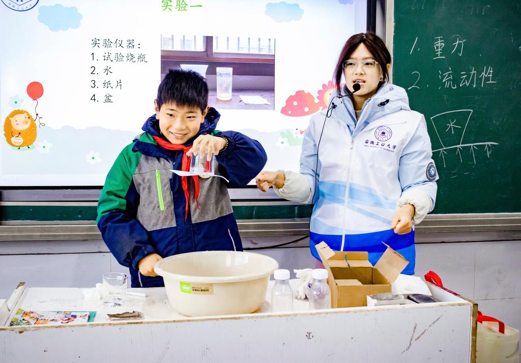 “数理行知”科普志愿队再度携手马鞍山市少年宫,走进马鞍山市丹阳中心学校,开展以“神奇的大气压”和“会跳舞的豆子”为主题的科学启蒙课。